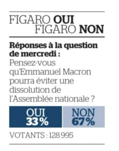 Le Figaro publie chaque jour, au bas de la une de son édition papier et sous le titre « Figaro oui, Figaro non », les résultats de la « question du jour » posée sur son site internet et son application mobile (voir ci-contre). Le 11 septembre 2025, la une donne à voir les réponses à la question « Pensez-vous qu’Emmanuel Macron pourra éviter une dissolution de l’Assemblée nationale ? ». Le Figaro précise qu’il y a eu 128 995 « votants » : ils sont 33 % à avoir cliqué sur « oui », et 67 % sur « non ».